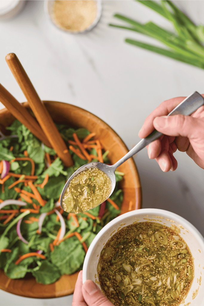 - Combine 3 tablespoons of the cooled tea (the rest may be discarded), green onion, honey, lemon juice, ginger and salt in a small bowl. Whisk in the oil and sesame seeds.