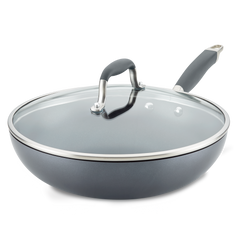 The Advanced Home 12-Inch Ultimate Stir Fry Pan features a sleek design with a shiny metal rim around its glass lid and hard-anodized construction. Its spacious, black surface is complemented by a raised arch handle for easy gripping, making it the ultimate pan for kitchen enthusiasts.