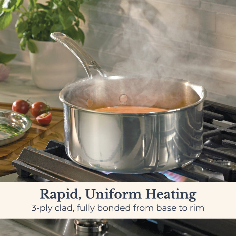 “Fully clad” means that layers of metal—stainless steel and aluminum—are bonded together from base to rim, not just at the bottom. This tri-ply construction allows heat to travel evenly across the entire pan, so every inch of your cooking surface performs with precision.